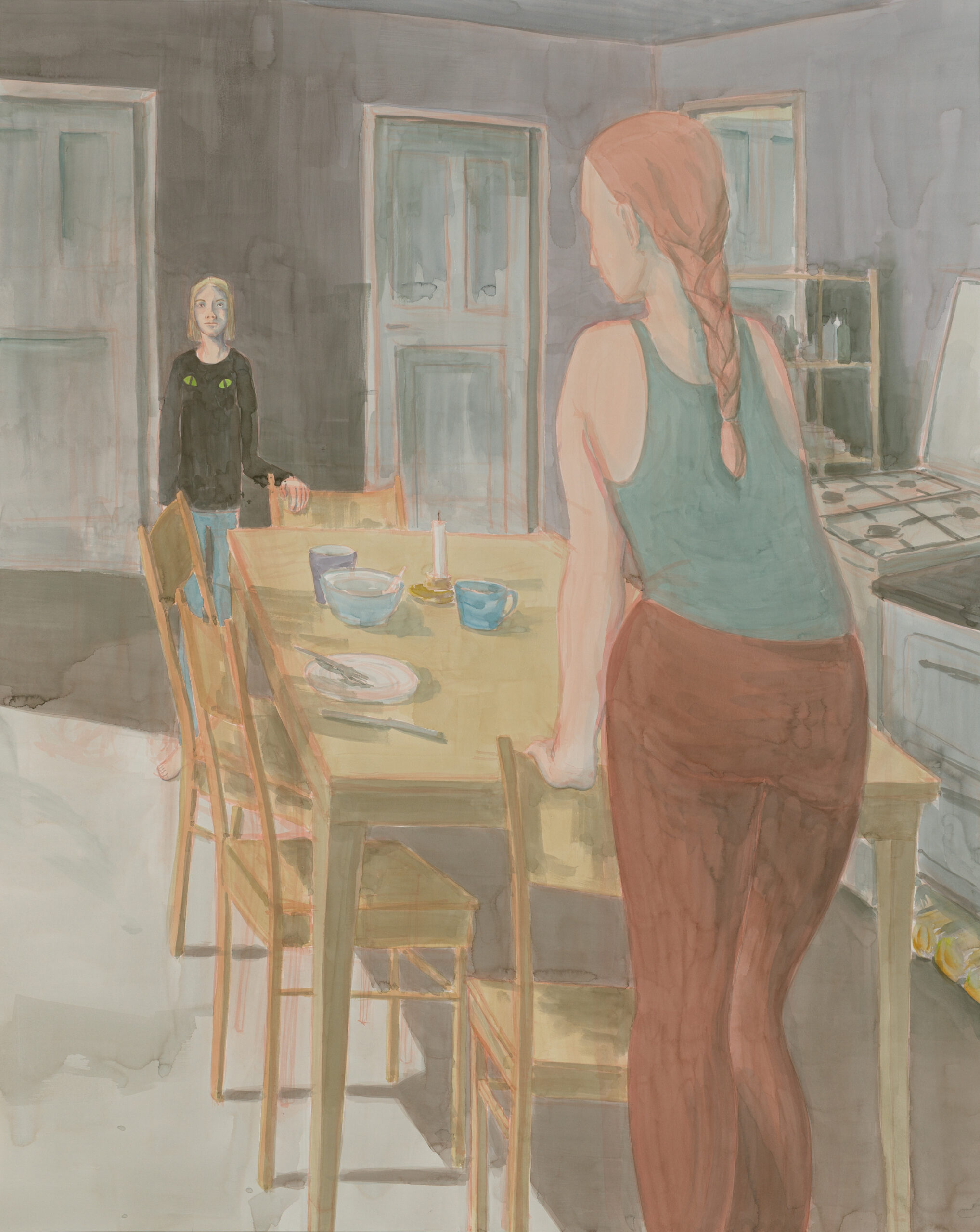 Die Motive sind soziale Konstellationen – weniger die Menschen selbst, die in Anna Kempes großformatigen Aquarellen auftreten. Konstellationen von Freund:innen, partnerschaftliche Verstrickungen, Eltern-Kind-Verhältnisse. Die Melancholie, die sich einstellt, sobald zu einem Menschen ein zweiter, dritter tritt. Es sind zumeist Momente der Freundschaft, des Konflikts, einer nachdenklichen Nähe, die in den Bildern Raum bekommen. Der Blick richtet sich auf die Fürsorge einander zugewandter Menschen. Klare Familienzusammenhänge treten hinter Wesensverwandtschaften zurück.