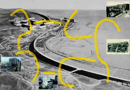 Plankopie, 2012, Digitale Montage: Projet Obus, Alger von Le Corbusier, Postkarte: Alger – Boulevard de la République et Ascenseur, (Edit. A. F.); Postkarte: Alger – Les Quais (Parmentier, édit., Alger); Pont de Télemly in Algier, nach einer Idee Le Corbusiers realisiertes, Wohnviadukt, Bilder in panoramio 41702769 von haninouya, Digitaldruck, 59,4 x 84 cm