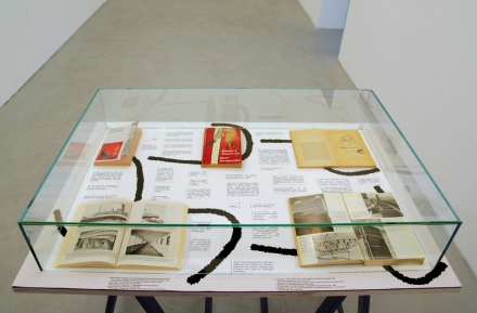 Vitrinentisch, 2013, Textdetails, diverse Bücher, Tischböcke: Höhe 75 cm, Holzplatte: 65 × 95 × 2 cm, Glashaube: 57 × 87 × 15 cm