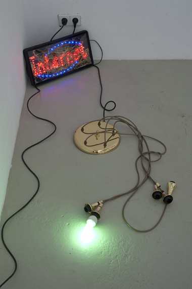 INTERNET 2011 manipulierte gefundene Objekte, LED Neontafel, Strohlampe, Grüne Energiesparlampe unterschiedliche Maße