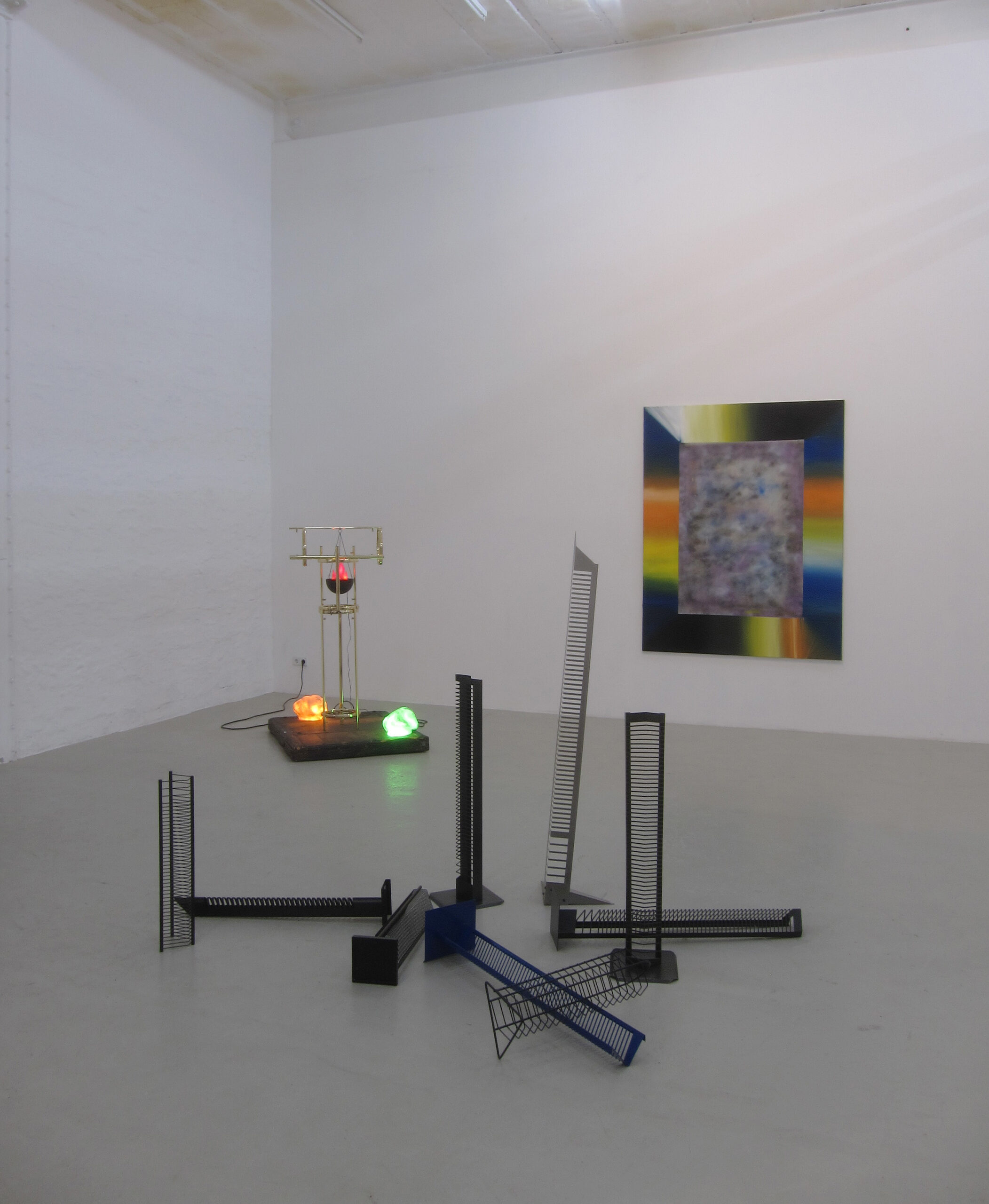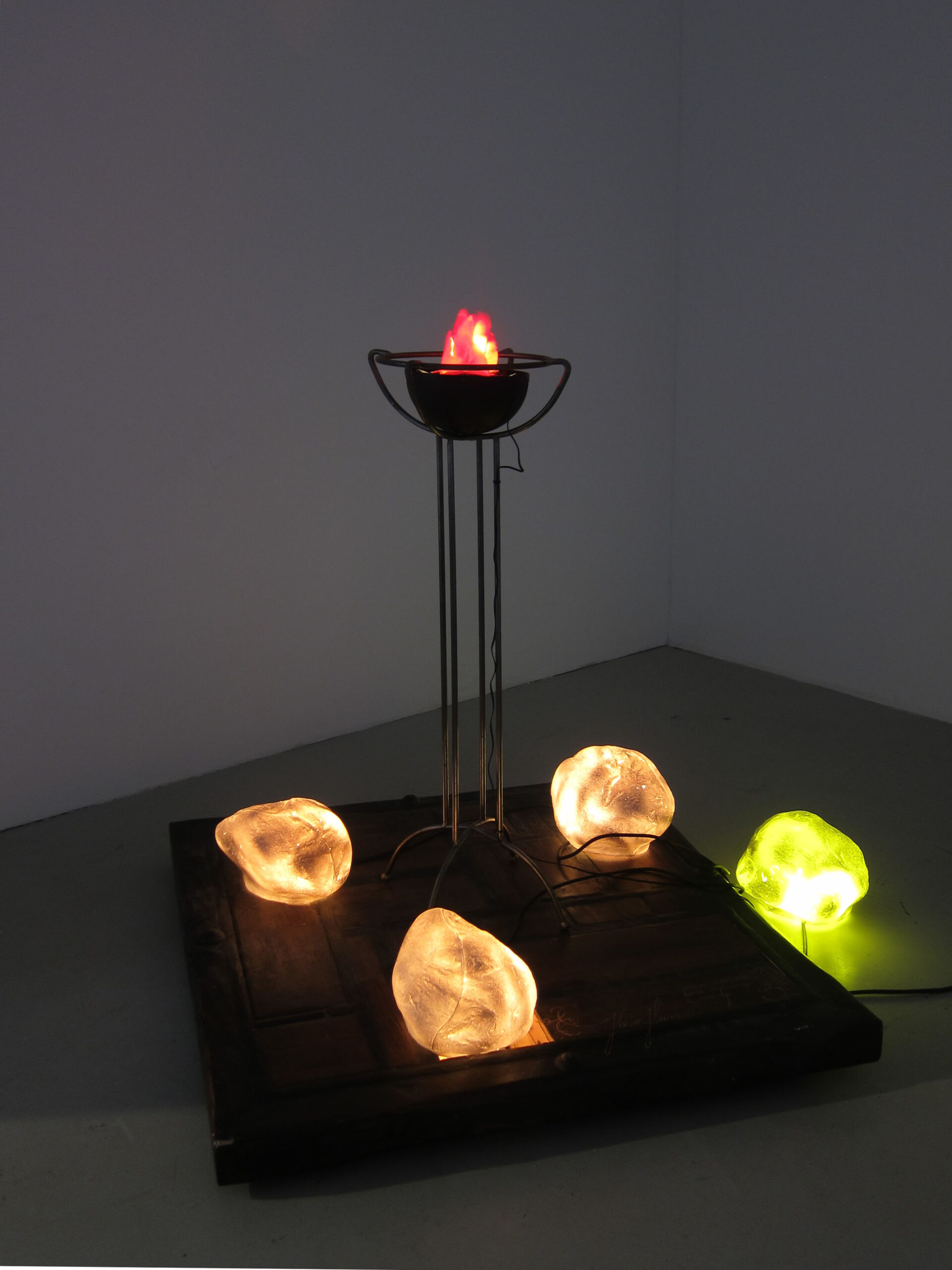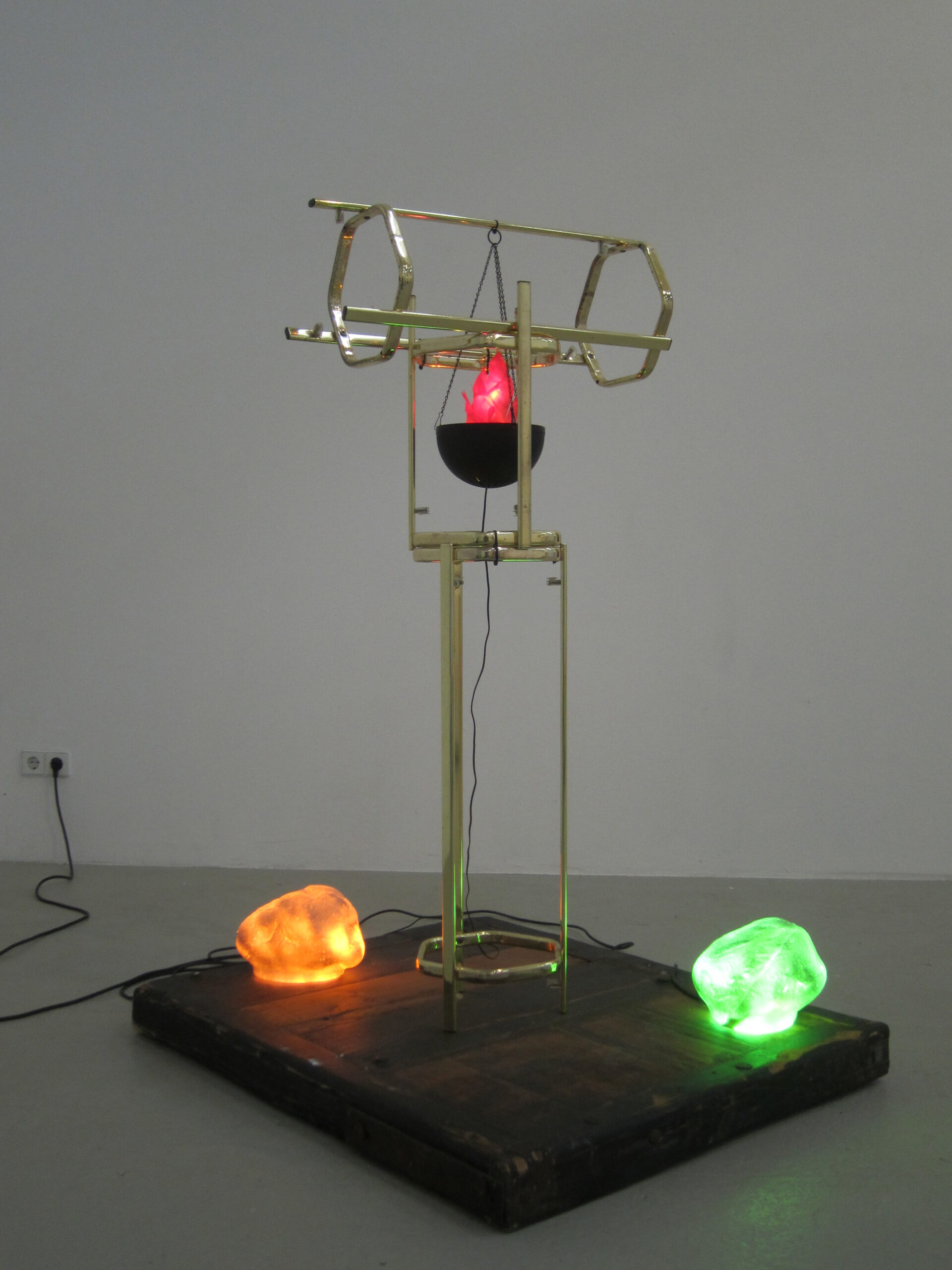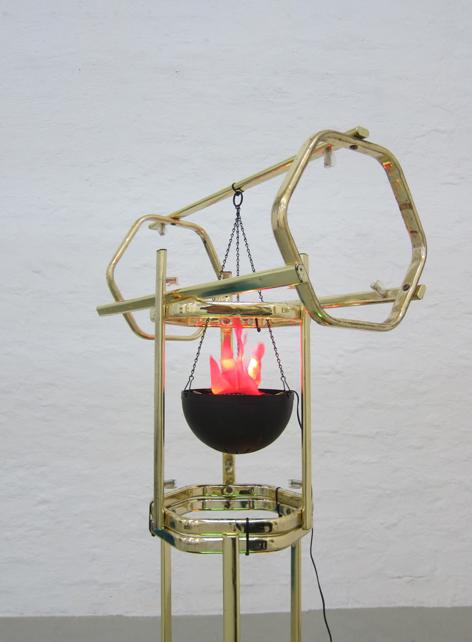 ITEM I, 2011 manipulierte gefundene Objekte, Holz, Metall, Plastik, Elektrifizierung, Künstlicher Feuerbecher mit Ventilator, Textil und Licht 100 x 120 x 160 cm