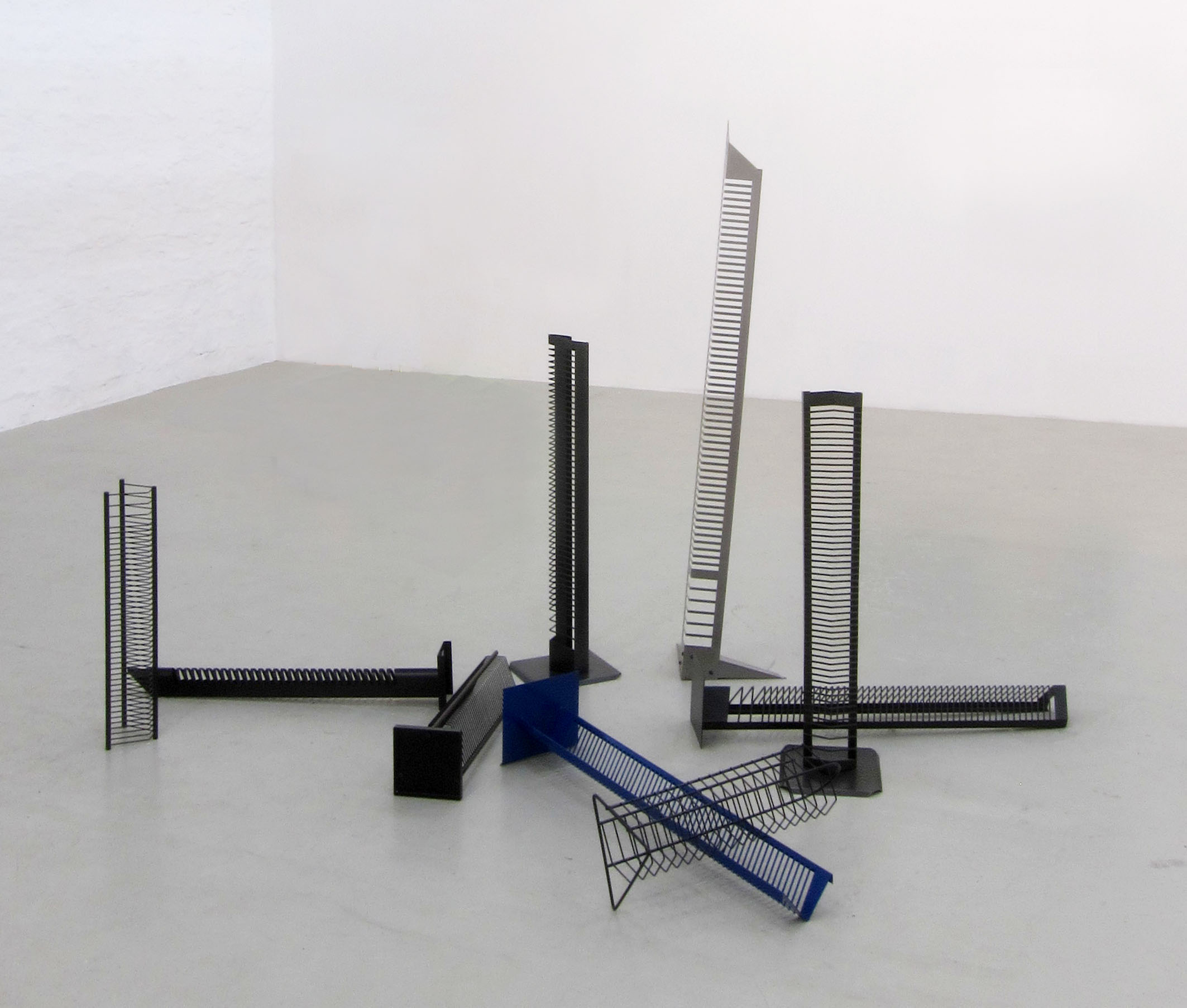 RUINS I, 2011 gefundene Objekte, CD-Regale, blau, schwarz, grau unterschiedliche Maße