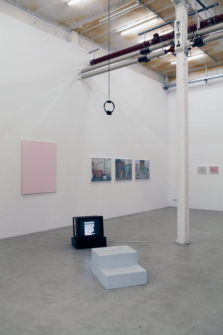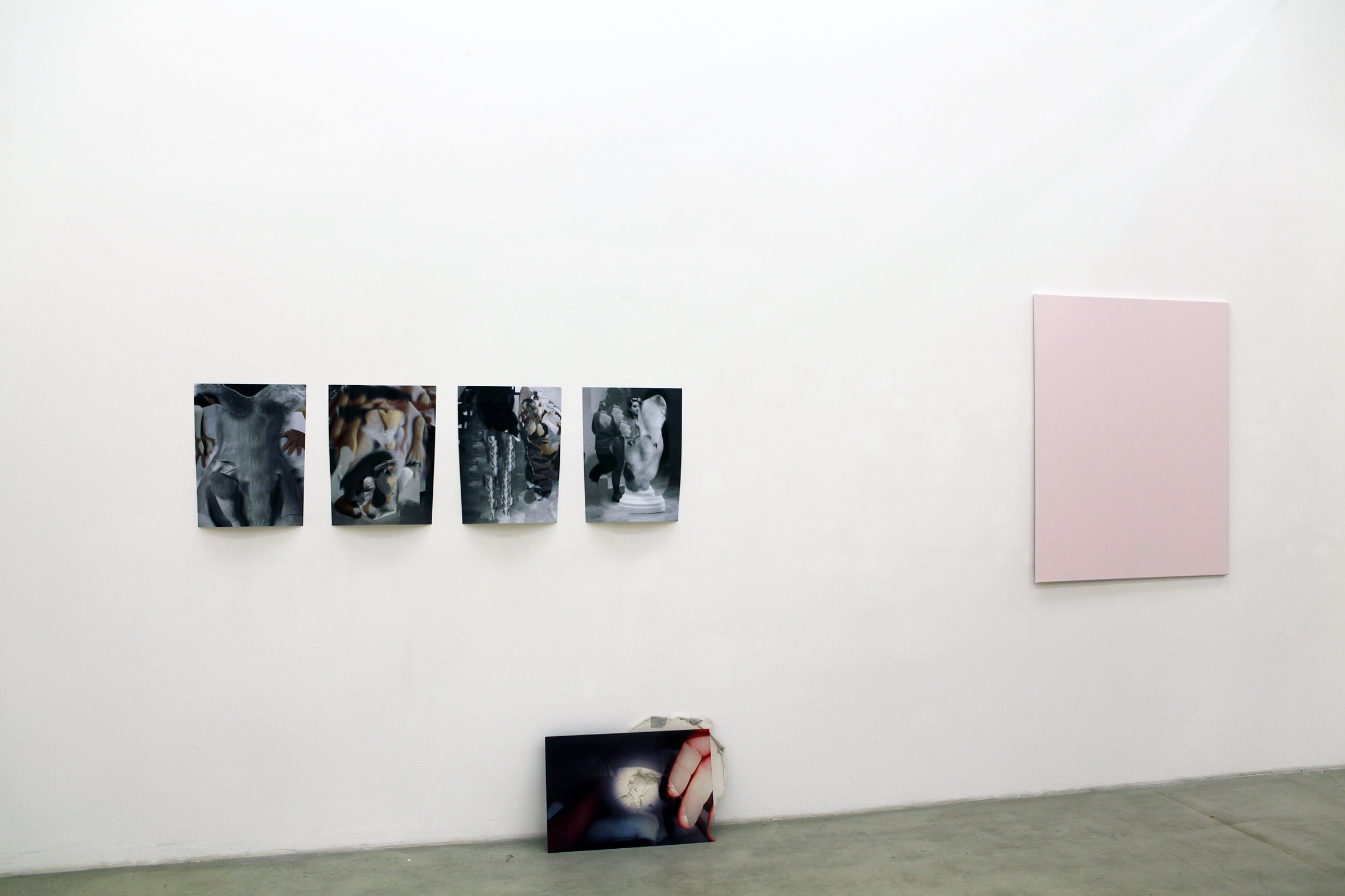 (links) Sophie Aigner, Rumpf und Plastik II, 2016, 4 Teile aus Serie von 6, Pigmentdrucke Falt- und Lehntattoo (pink I), 2015, UV-Druck auf Glas, Gips, Textil (rechts) Paulina Gimpel, The truth is I have nothing to tell you, 2016 Stickbild, Stickgarn auf Leinwand mit Acryl
